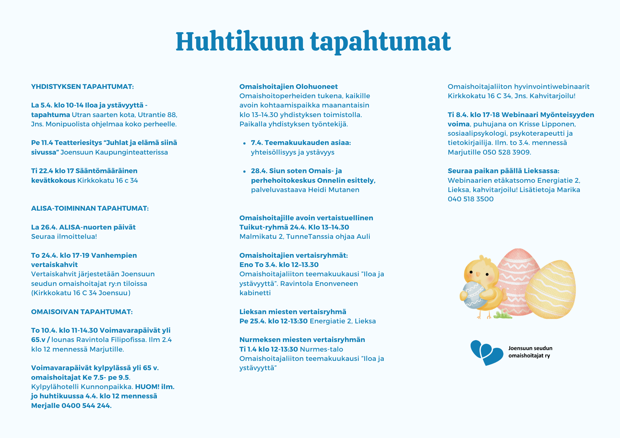 To 24.4. klo 17-19 Vanhempien vertaiskahvit Vertaiskahvit järjestetään Joensuun seudun omaishoitajat ry:n tiloissa (Kirkkokatu 16 C 34 Joensuu)